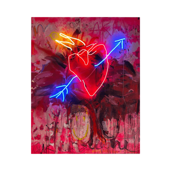 Marta Vaarik “I am super” (2023-2025), acrylic on canvas, neon lamps, 200×160 cm