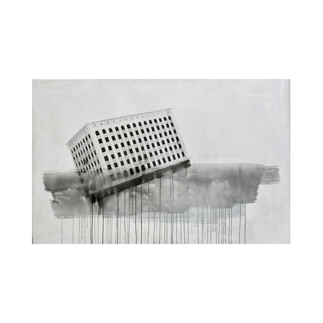 Britta Benno “Düstoopiline Tallinn, Klubi VaBank” (2018), 130 x 200 cm, segatehnika lõuendil